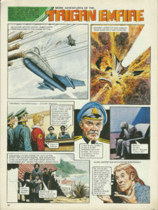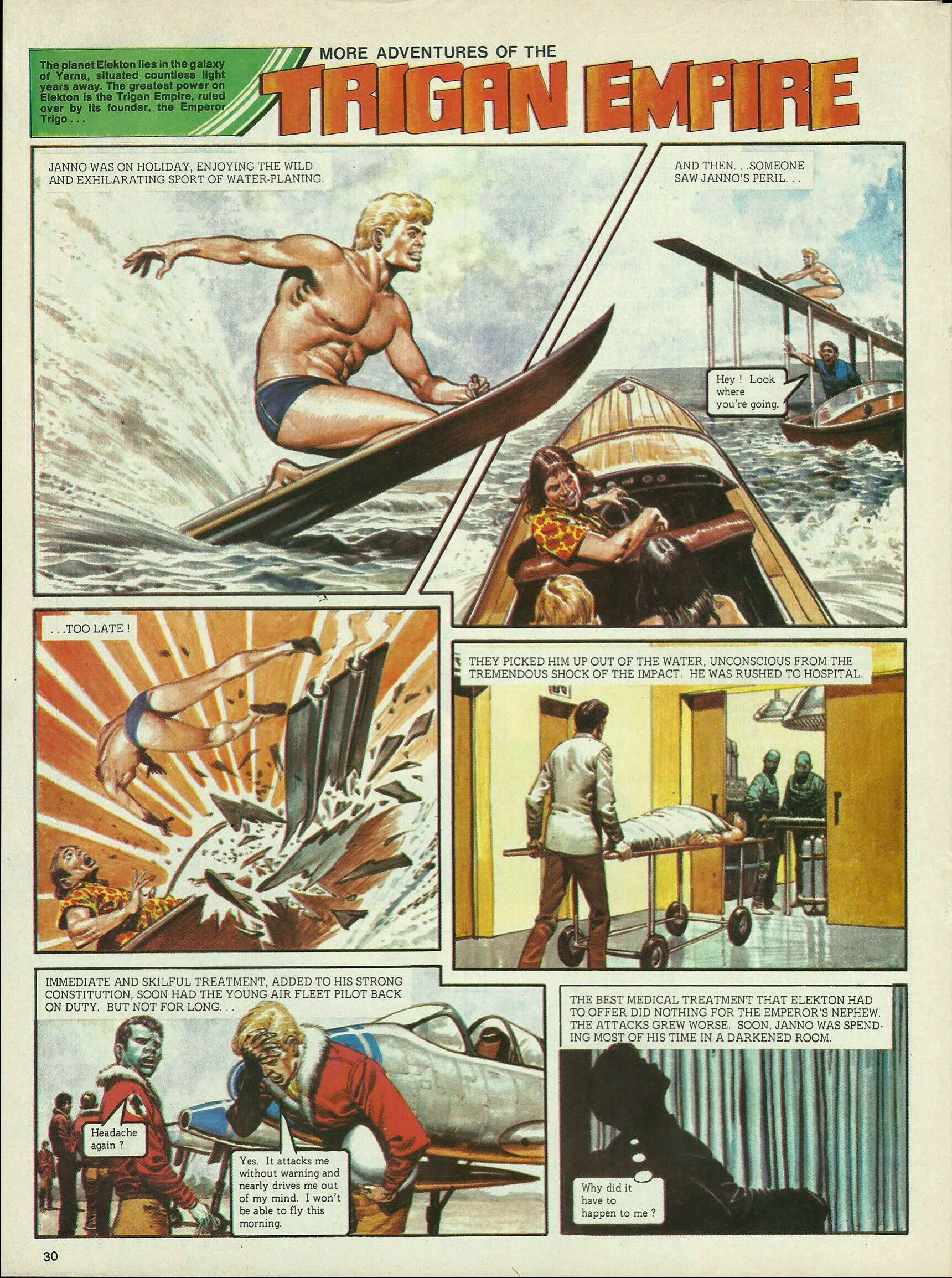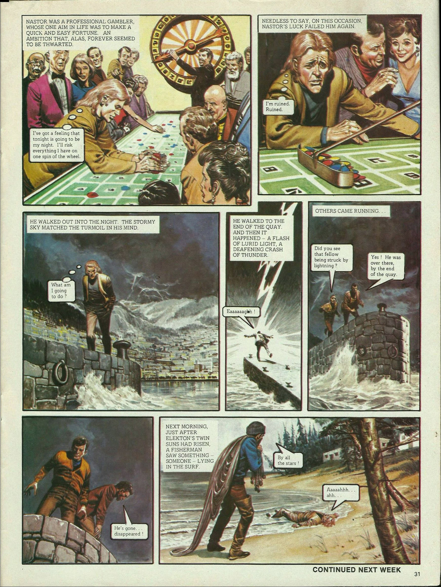 Posted on October 18, 2025October 31, 2025The Gambler’s Gift Janno was on holiday, enjoying the wild and exhilarating sport of water-planing. And then . . . someone saw Janno’s peril . . . Hey ! Look where you’re going. . . . Too late ! They picked him up out of the water, unconscious from the tremendous shock of the impact. He was rushed to hospital. Immediate and skilful treatment, added to his strong constitution, soon had the young air fleet pilot back on duty. But not for long . . . Headache again ? Yes. It attacks me without warning and nearly drives me out of my mind. I won’t be able to fly this morning. The best medical treatment that Elekton had to offer did nothing for the Emperor’s nephew. The attacks grew worse. Soon, Janno was spending most of his time in a darkened room. Why did it have to happen to me ? Your browser does not support the video tag. Your browser does not support the video tag. Your browser does not support the video tag. Nastor was a professional gambler, whose one aim in life was to make a quick and easy fortune. An ambition that, alas, forever seemed to be thwarted. I’ve got a feeling that tonight is going to be my night. I’ll risk everything I have on one spin of the wheel. Needless to say, on this occasion, Nastor’s luck failed him again. I’m ruined. Ruined. He walked out into the night. The stormy sky matched the turmoil in his mind. What am I going to do ? He walked to the end of the quay. And then it happened —a flash of lurid light, a deafening crash of thunder. Eaaaaaaghh ! Others came running . . . Did you see that fellow being struck by lightning ? Yes ! He was over there, by the end of the quay. He’s gone . . . disappeared ! Next morning, just after Elekton’s twin suns had risen, a fisherman saw something—someone —lying in the surf. By all the stars ! Aaaaahhh . . . ahh . . . This instalment was originally published in Look and Learn issue no. 718 on 18 October 1975.