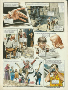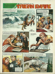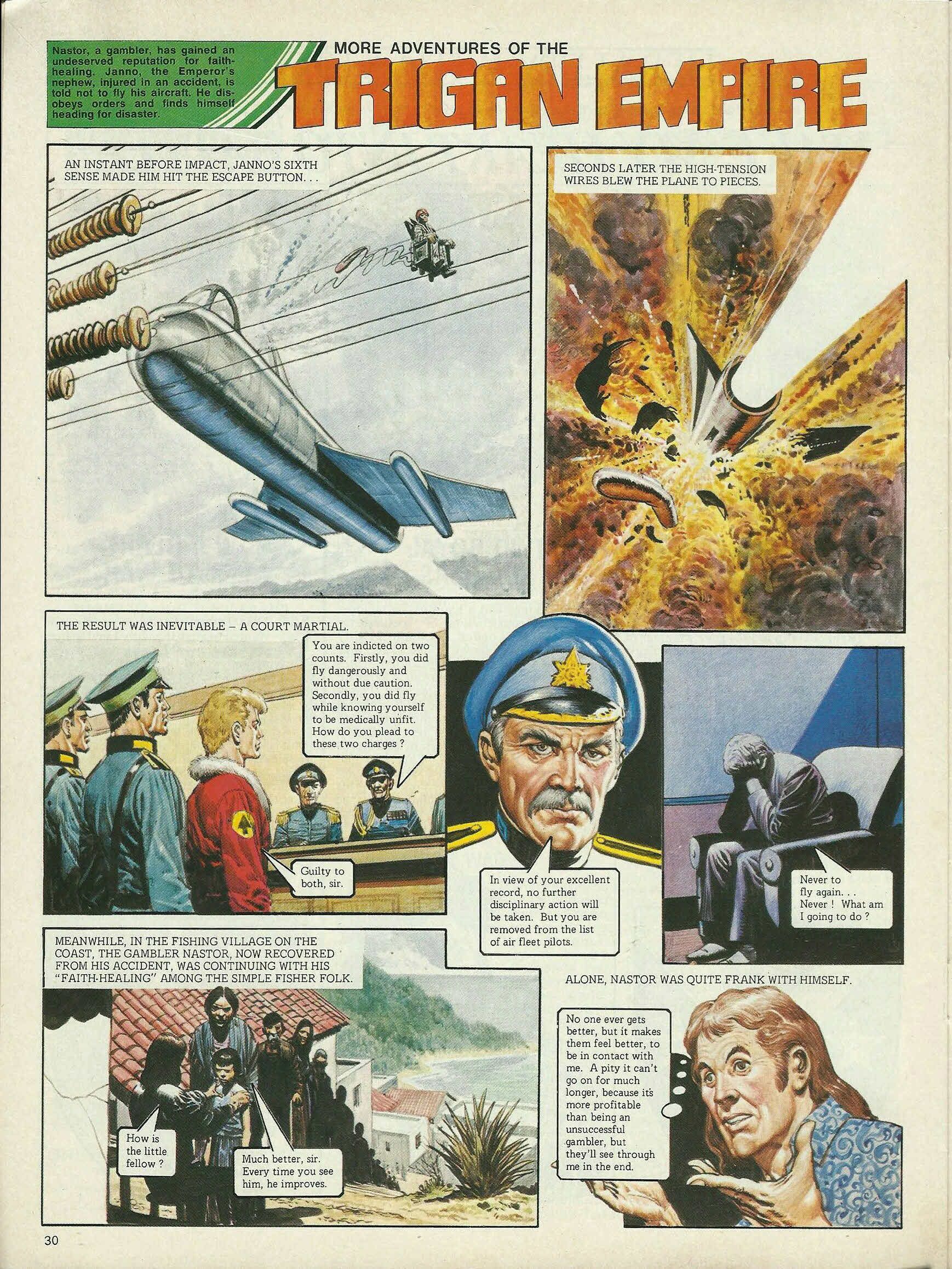 Posted on October 25, 2025October 31, 2025The Gambler’s Gift (continued . . .) The fishermen dragged the half- conscious form from the surf. Later, Nastor opened his eyes to find a row of honest faces looking down on him. Here, friend, take a little gruel. It will make you strong again. A couple of days later, Nastor felt strong enough to try and feed himself. He reached out for a spoon . . . There ! See how much better you are, friend. And the spoon hung suspended in the air ! Aaaaaaaah ! The superstitious fisher-folk thought they had the answer to this strange phenomenon. He is a miracle- worker ! One of the wise ones ! I knew of such a one when I was a lad. He could cure all manner of sicknesses ! Within a few days, the news had spread among the simple people of the coast. A long line of patient figures queued outside the cottage where Nastor lay. Touch my son and make him well again, sir. I beg of you. All the people asked of Nastor was the touch of his hand or a few words of comfort, then they departed happily, leaving behind a few coins or some food. I feel better already, sir. I’m pleased to hear it. The simple folk would have been surprised to know the thoughts that were passing through the “wise one’s” mind. I don’t know how long these stupid fools are going to treat me like some kind of god, but I’ll stay here until I get my strength back and at the same time make some money on the side. Meanwhile, in Trigan City Air Fleet base, Janno was making one last desperate bid to continue his career as a pilot. Janno, you’re in no fit state to fly with those blinding headaches. Why not take a year’s leave and get fit again. I’m better, I tell you, Keren ! And I’ll prove it . . . today ! Janno’s proof of his fitness to fly was a demonstration of low-level aerobatics that had the whole base staring in awe. But, in the cockpit . . . Aaaaah ! My head ! The agony ! Blinded by the pain, Janno never saw his peril . . . He’s going to crash into the high-tension wires ! This instalment was originally published in Look and Learn issue no. 719 on 25 October 1975.