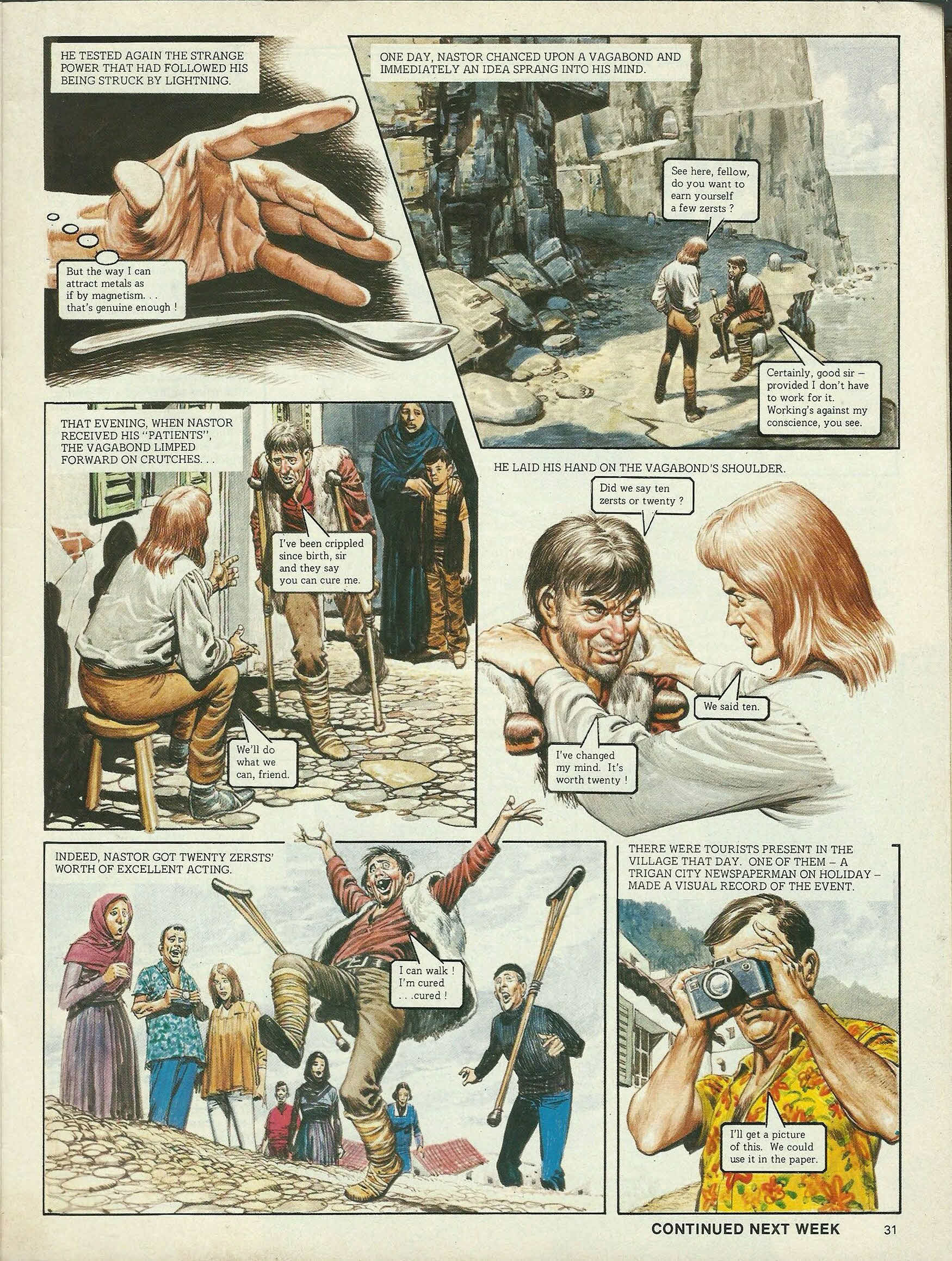 Posted on November 1, 2025November 1, 2025The Gambler’s Gift (continued . . .) An instant before impact, Janno’s sixth sense made him hit the escape button . . . Seconds later the high-tension wires blew the plane to pieces. The result was inevitable—a court martial. You are indicted on two counts. Firstly, you did fly dangerously and without due caution. Secondly, you did fly while knowing yourself to be medically unfit. How do you plead to these two charges ? Guilty to both, sir. In view of your excellent record, no further disciplinary action will be taken. But you are removed from the list of air fleet pilots. Never to fly again . . . Never ! What am I going to do ? Meanwhile, in the fishing village on the coast, the gambler Nastor, now recovered from his accident, was continuing with his “faith-healing” among the simple fisher folk. How is the little fellow ? Much better, sir. Every time you see him, he improves. Alone, Nastor was quite frank with himself. No one ever gets better, but it makes them feel better, to be in contact with me. A pity it can’t go on for much longer, because it’s more profitable than being an unsuccessful gambler, but they’ll see through me in the end. He tested again the strange power that had followed his being struck by lightning. But the way I can attract metals as if by magnetism . . . that’s genuine enough ! One day, Nastor chanced upon a vagabond and immediately an idea sprang into his mind. See here, fellow, do you want to earn yourself a few zersts ? Certainly, good sir— provided I don’t have to work for it. Working’s against my conscience, you see. That evening, when Nastor received his “patients”, the vagabond limped forward on crutches . . . I’ve been crippled since birth, sir, and they say you can cure me. We’ll do what we can, friend. He laid his hand on the vagabond’s shoulder. Did we say ten zersts or twenty ? We said ten. I’ve changed my mind. It’s worth twenty ! Indeed, Nastor got twenty zersts’ worth of excellent acting. I can walk ! I’m cured . . . cured ! There were tourists present in the village that day. One of them—a Trigan City newspaperman on holiday—made a visual record of the event. I’ll get a picture of this. We could use it in the paper. This instalment was originally published in Look and Learn issue no. 720 on 1 November 1975.