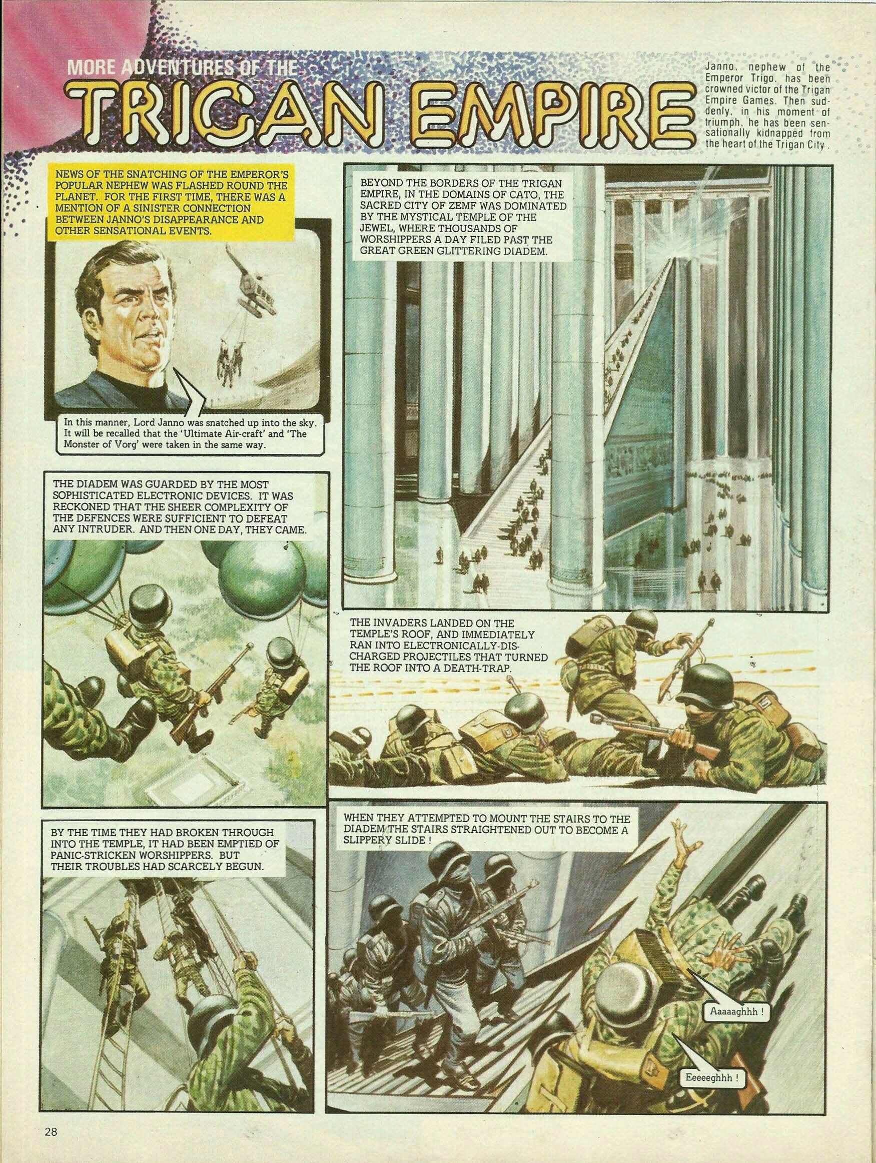 Posted on December 6, 2025December 9, 2025The Ultimate Collection (continued . . .) All Trigan City turned out to see the fossilised monster being carried off. They’ve got the Monster of Vorg ! The Air Fleet defences of the city were hastily sent up. Head for area three-five-one. Intercept, but do not open fire. Understood ? Order received and understood. Later . . . Leader of the interceptors reports they’ve lost contact sir. With a thing that size ? Impossible ! When it was all over, the experts went through the operation in detail and came up with a surprising conclusion. The thieves, whoever they are, made their escape in this direction. Shortly before passing the boundary of greater Trigan City, they disappeared from sight. So we estimate that “the Monster of Vorg” is still somewhere near at hand ! Speculation about the missing giant fossil was on everyone’s lips for a few days. The incident was then completely overshadowed by—the Trigan Empire Games ! People of the planet Elekton. We proudly present the twentieth Trigan Empire Games ! A star athlete and strong contender for the victor’s grand crown was Janno, the Emperor’s nephew. Competitors for the pole-climbing take your places. Good luck, Janno. Pole-climbing—the most physically-demanding and dangerous of all Elekton athletic events and Janno was the first to plant his flag. Then followed the ancient and traditional five-zarra foot race, the competitors bearing armour and weapons with Janno again the winner. Throwing the spear from a galloping kreed meant another win for Janno. With three firsts in main events and sundry other placings, the Emperor’s nephew was an outright winner of the victor’s grand crown. Well done, lad ! Thanks, Uncle ! It was while he was making a triumphal circuit of the stadium that . . . . . . It happened ! Uuuuuhhh ! Before a finger could be lifted to help him, the victor of the games was snatched into the sky. Janno ! This instalment was originally published in Look and Learn issue no. 725 on 6 December 1975.