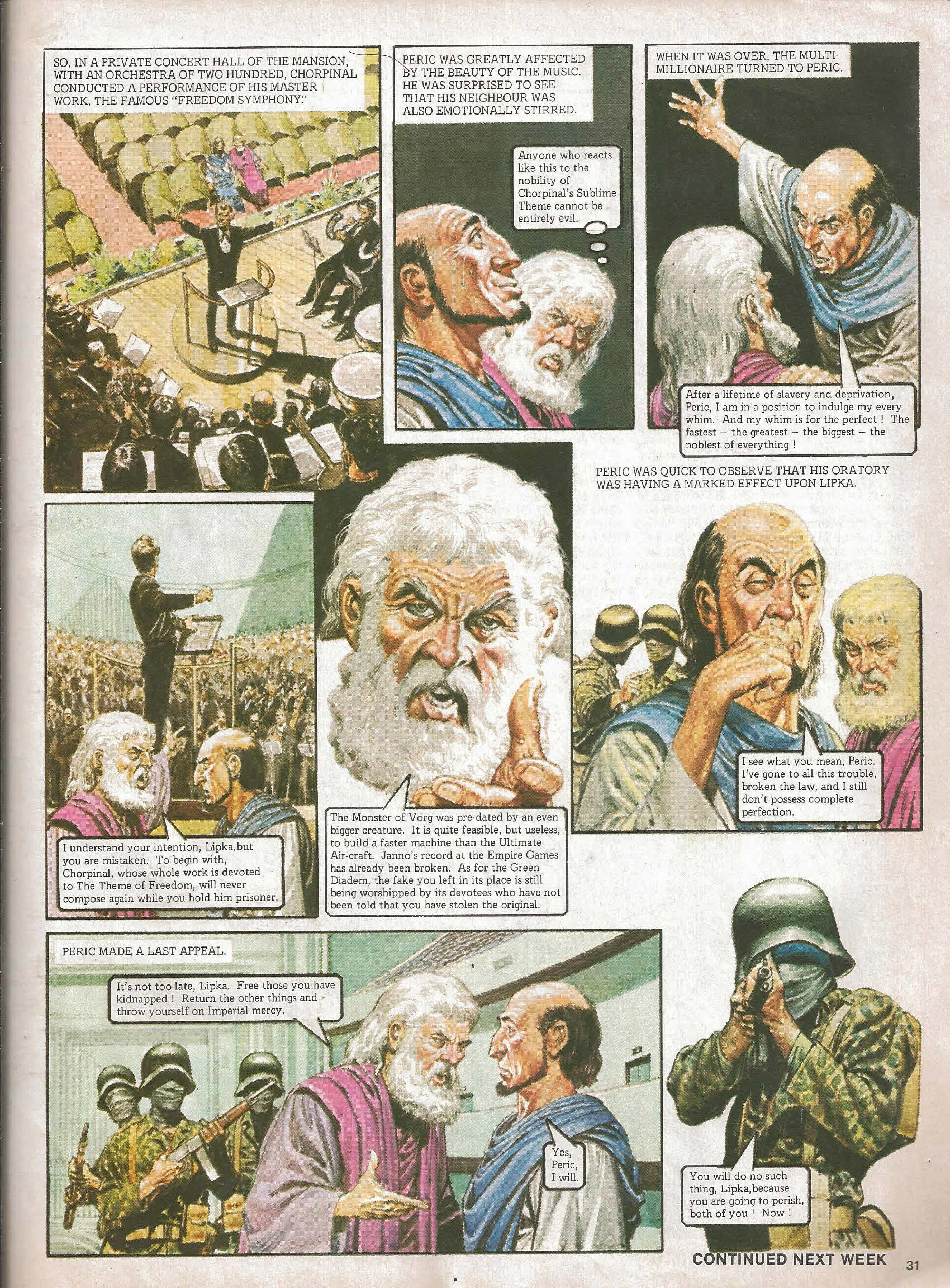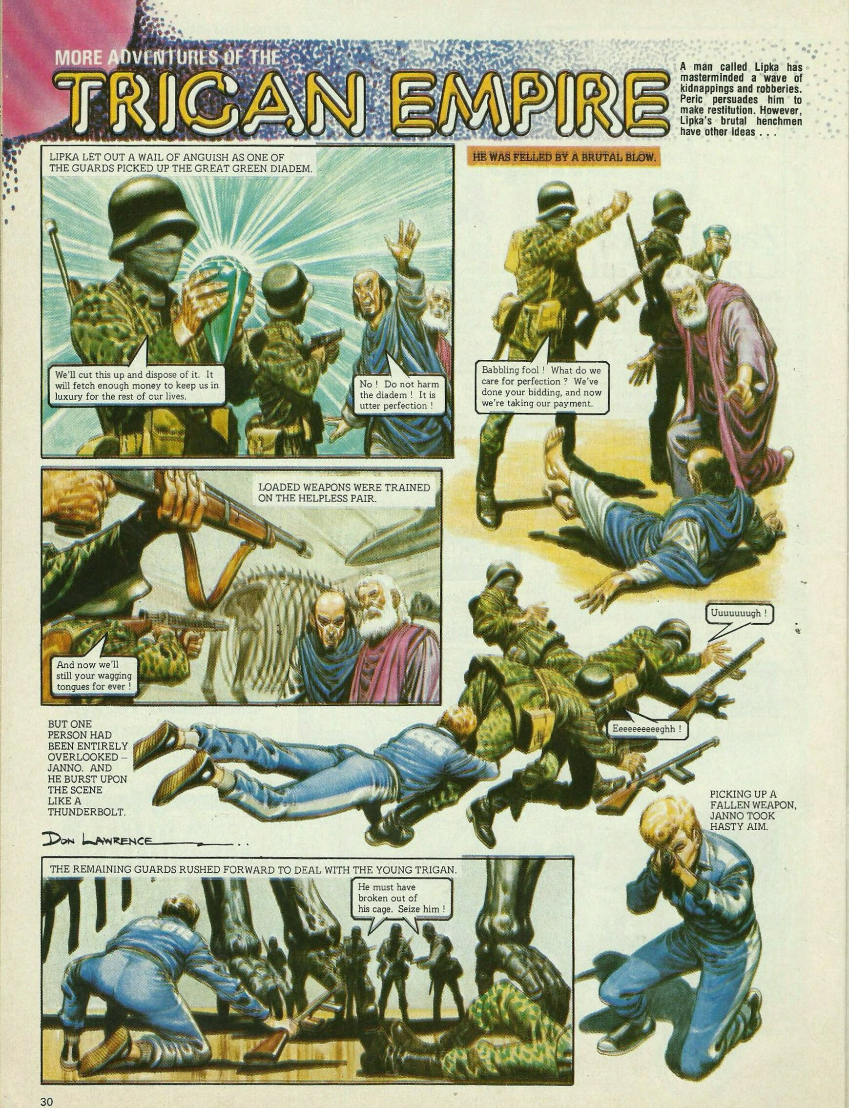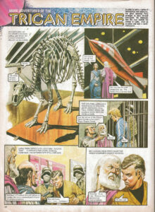 Lipka let out a wail of anguish as one of the guards picked up the Great Green Diadem. We’ll cut this up and dispose of it. It will fetch enough money to keep us in luxury for the rest of our lives. No! Do not harm The diadem! It is utter perfection! He was felled by a brutal blow. Babbling fool! What do we care for perfection? We’ve done your bidding, and now we’re taking our payment. Loaded weapons were trained on the helpless pair. And now we’ll still your wagging tongues for ever! But one person had been entirely overlooked—Janno. And he burst upon the scene like a thunderbolt. Uuuuuuugh! Eeeeeeeeeeghh! The remaining guards rushed forward to deal with the young Trigan. He must have broken out of his cage. Seize him! Picking up a fallen weapon, Janno took hasty aim.The projectiles neatly severed the massive vertebrae of the Monster of Vorg and the great fossilised bones came hurtling down. Aaaaaaah! No! Eeeeeeeeh! Moments later, all was silent in the great hall. Peric laid his hand on the shoulder of he who had collected perfection. Come, Lipka. I will be at your side when you confess all. You have been good to me, Peric—better than I deserve. The great scientist pleaded Lipka’s case before the highest authority of the empire, Trigo himself. It is my submission, Imperial Majesty, that Lipka has not stolen for profit, nor has he done any bodily harm to anyone. Furthermore, he is willing to make full restitution for any damage or inconvenience caused by his insatiable desire to be surrounded by perfection. I am willing to pardon him, provided we can be assured that he keeps his insatiable desire in check. Any suggestions, Peric? Yes, Sire. Frankly, this fellow is bored to death by being a multimillionaire. He needs a job of work! What employment have you in mind? I thought your Imperial Majesty might appoint him—Curator-General of the Imperial Museums! And so, Lipka was from then on surrounded by the perfection he craved. As Curator-General, he was responsible for every museum in the vast empire. And all mine! . . . In a manner of speaking! His eye often fell upon the restored fossil of the Monster of Vorg, and then he remembered. Was that really the fiercest thing that ever lived, sir? Yes, my boy, and it can still smite mightily, I assure you!