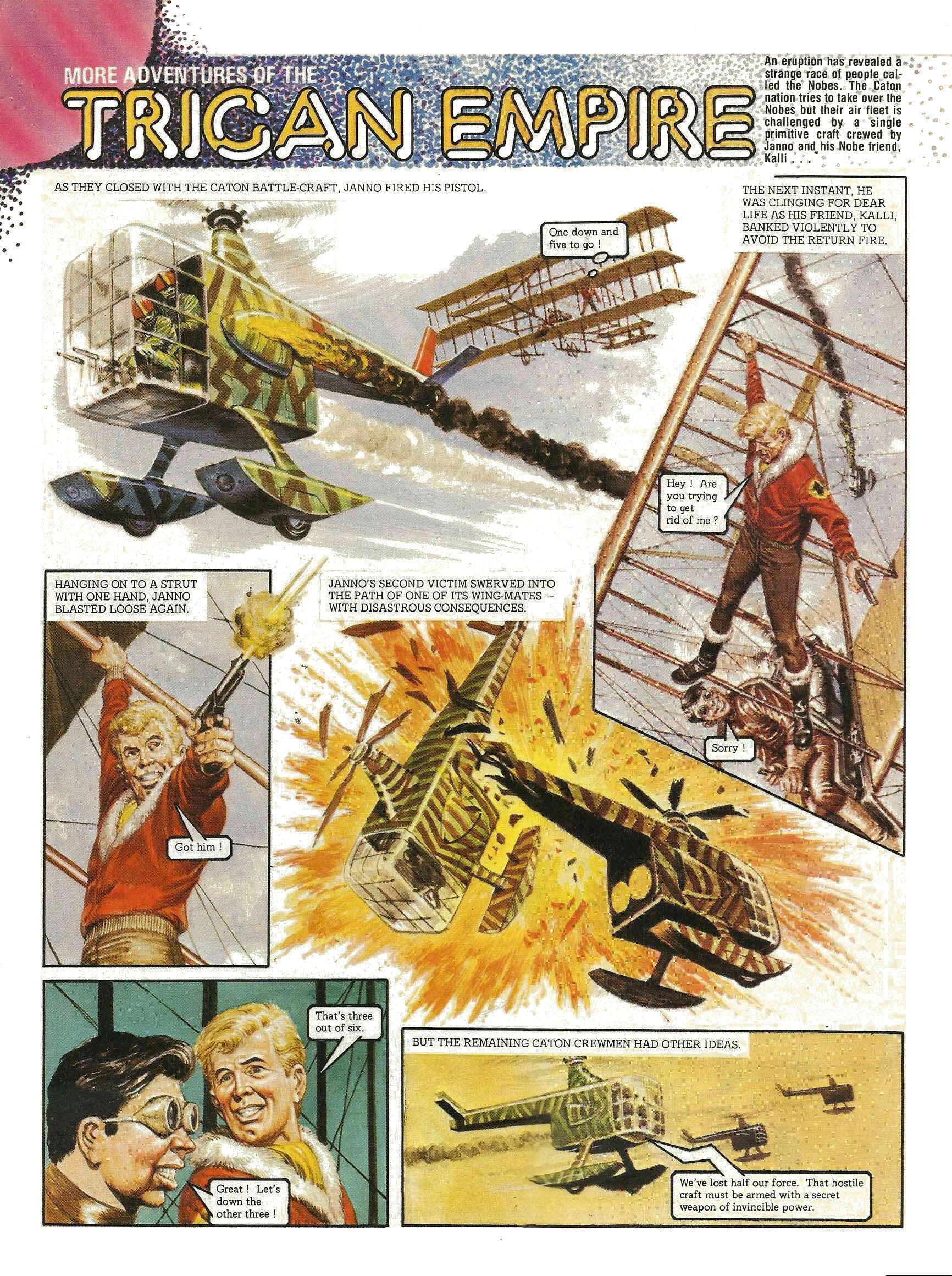 As they closed with the Caton battle-craft, Janno fired his pistol. One down and five to go! The next instant, he was clinging for dear life as his friend, Kalli, banked violently to avoid the return fire. Hey! Are you trying to get rid of me? Sorry! Hanging on to a strut with one hand, Janno blasted loose again. Got him! Janno’s second victim swerved into the path of one of its wing-mates—with disastrous consequences. That’s three out of six. Great! Let’s down the other three! But the remaining Caton crewmen had other ideas. We’ve lost half our force. That hostile craft must be armed with a secret weapon of invincible power.