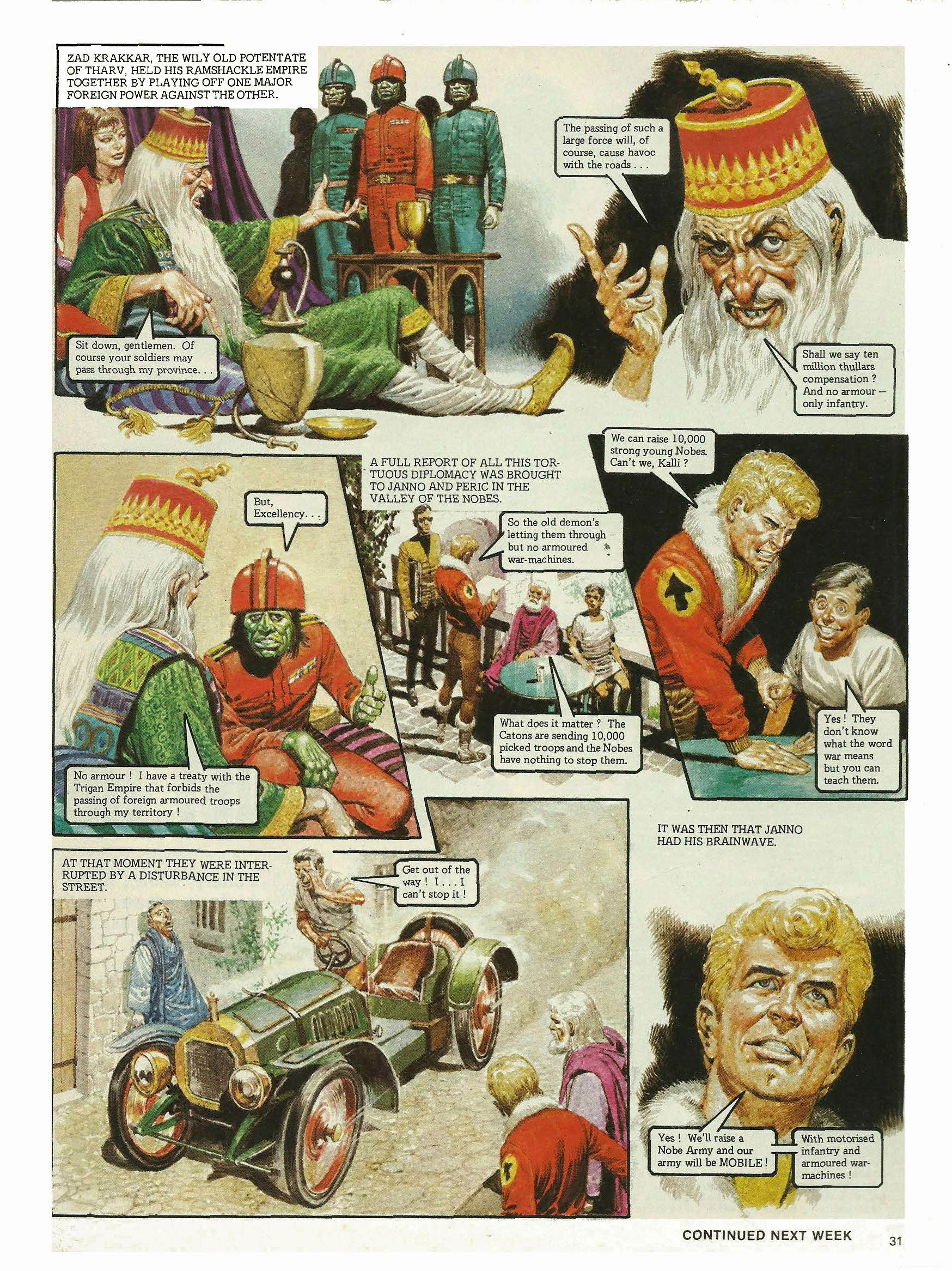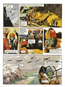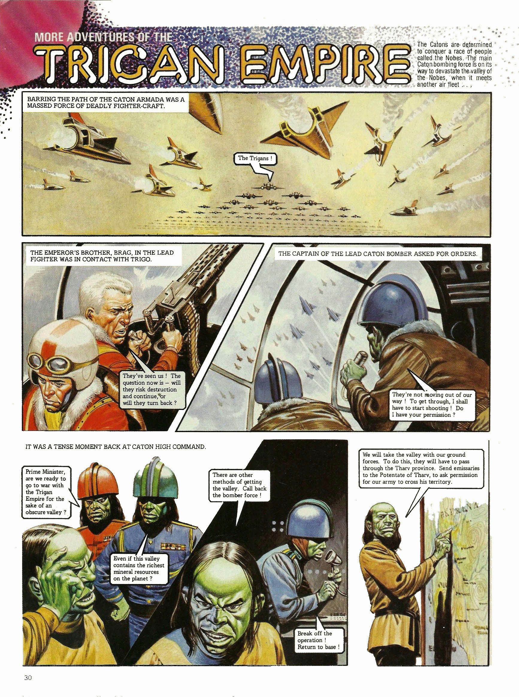 At dawn the following day, the massed air fleet of Cato flew low over the valley of the Nobes in a brutal display of power. The people of the valley stared up, awestruck. It can’t be true! It’s some kind of trick! Living creatures can’t fly so high and so fast! Later, the Caton emissaries delivered an ultimatum to the Nobes. The Nobes will acknowledge the overlordship of the Caton state, or the people and cities of the valley will be destroyed from the air. What you suggest is absurd. Next, the emissaries of the Trigan Empire, with Janno as spokesman. The Trigan Empire offers you the protection of its power. All you have to do is ask. I thank the Trigan Empire, but we can look after ourselves. After all, we, too, have a superior technology. Think, for instance of our air fleet! As Janno said later, to his new friend Kalli. Do you think you could defend the valley for any length of time with that collection of museum pieces? We can but do our best. If the Catons come, I, for one, will take the air against them! Then I request the honour to accompany you, Kalli! Back in far-off Trigan City, the latest news reached the Emperor Trigo and his advisors. Well, gentlemen, what can we do? The Nobes have rejected our help. If our forces entered now, we would be as guilty of invasion as the Catons. Then the Catons have outmanoeuvred us. Order Janno and Peric to return.